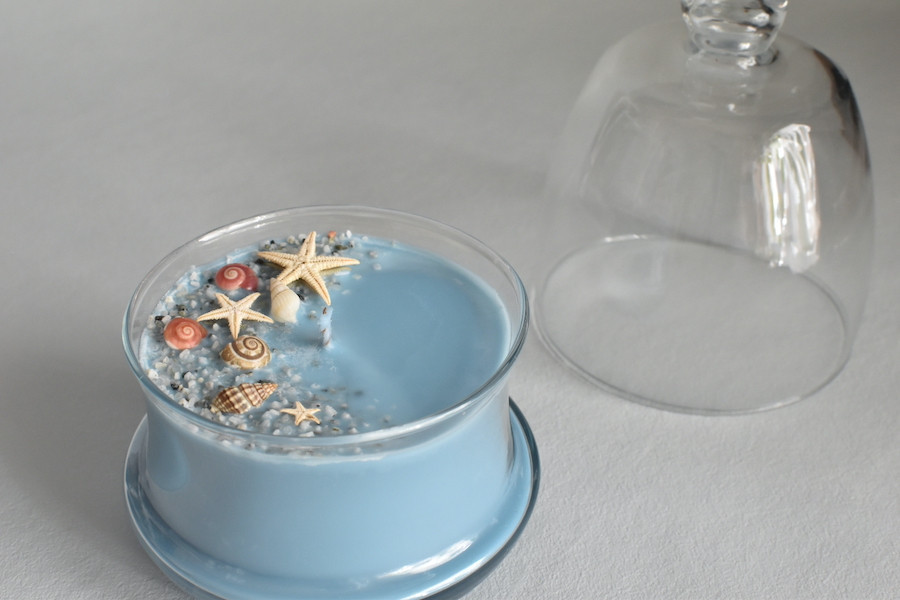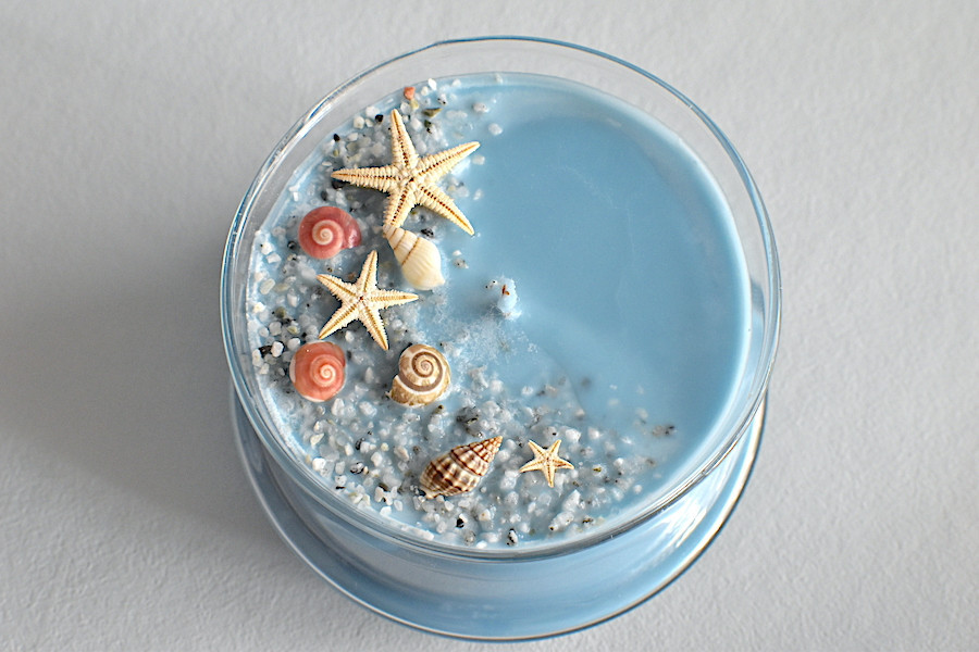 200 Gramos de Cera vegetal de Soja con decoración natural, arena, conchas y estrellas de mar.