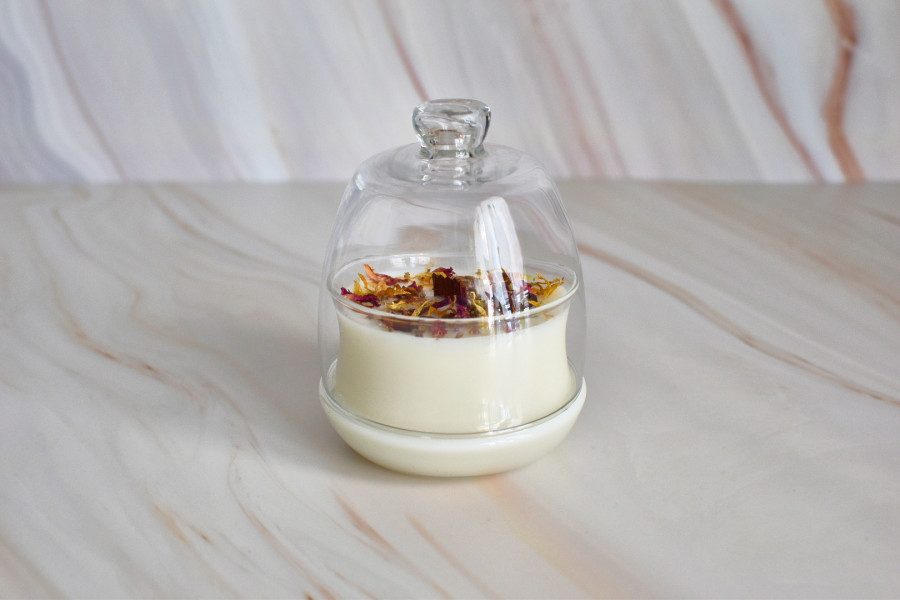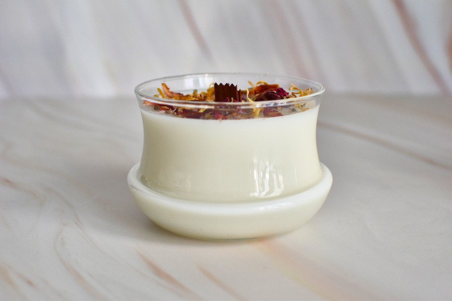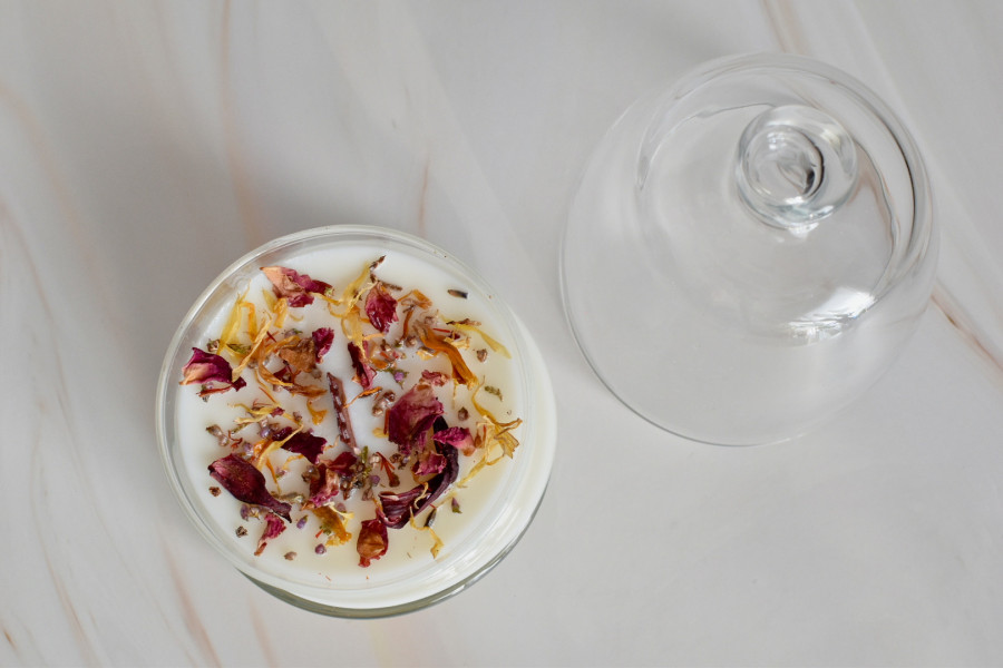 200 Gramos de Cera vegetal de Soja decorada con una mezcla de pétalos de flores naturales y doble mecha de madera.