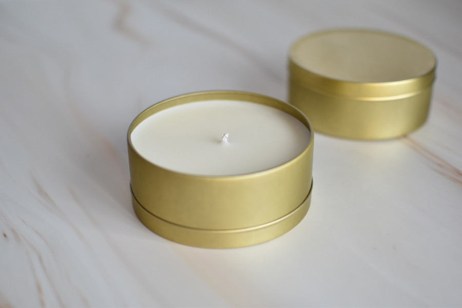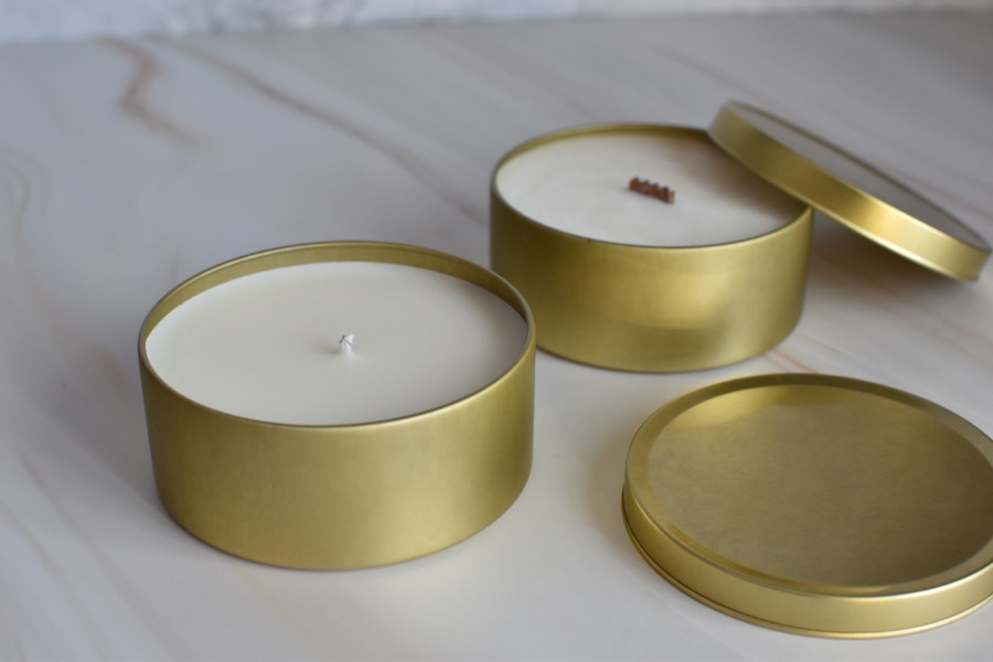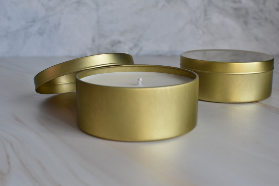 Vela Órix en envase metálico dorado.